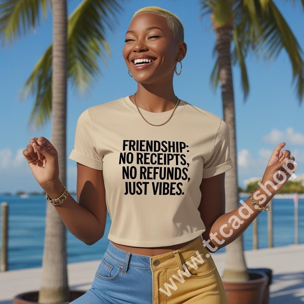 Friendship Tee — “No Receipts. Just Vibes.” Short Sleeve / Crop Top T-Shirt by TtCAD